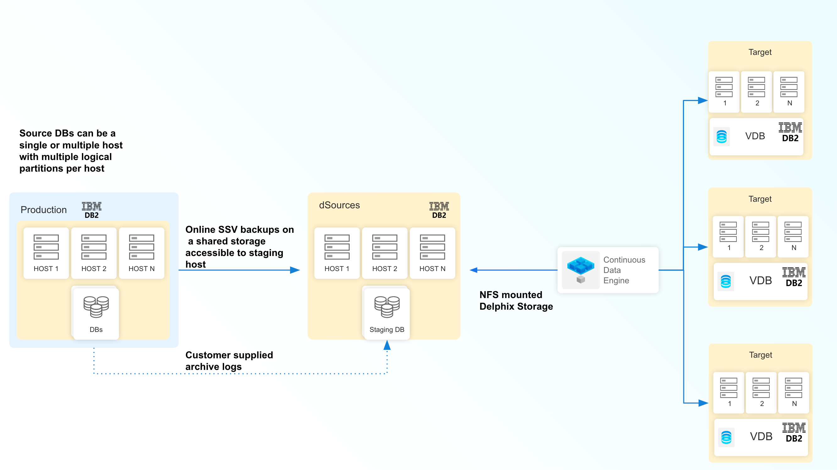 Delphix Continuous Data Engine and the IBM Db2 connector should not be considered a replacement for backup and recovery of your source instances and databases. The Delphix Continuous Data Engine solution is intended for very different purposes, primarily to create non-production database copies.