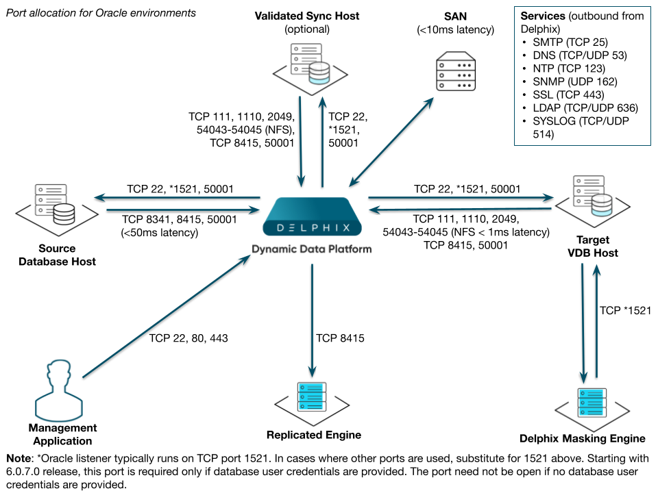 The Delphix Engine makes use of the following network ports for Oracle dSources and VDBs: