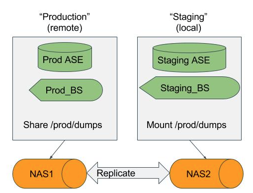 If the source ASE instance resides on the same server as the staging ASE instance, the staging database's NFS mounted "temp" directory will be present for the source database to write to in response to the "DUMP DATABASE" command.