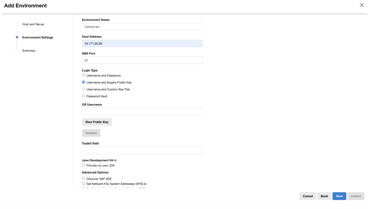 When following the Add Environment wizard and on the Environment Settings page, select Public Key for the Login Type.