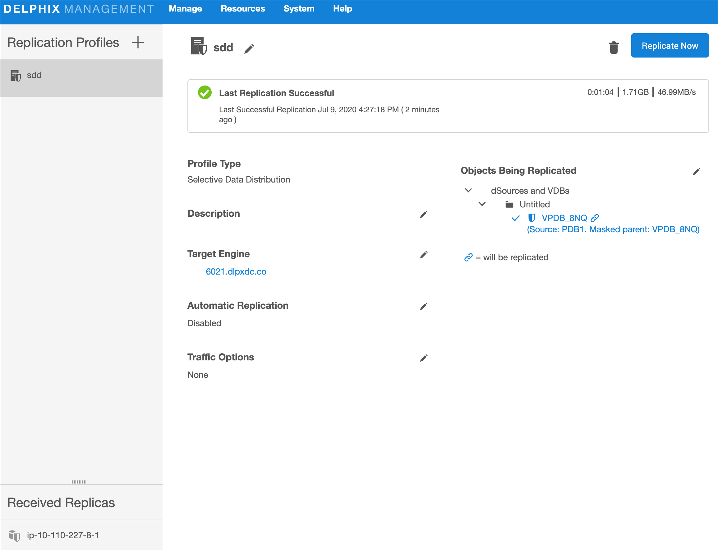 This section is used to illustrate the capabilities in the SDD Profiles section. From the Delphix Management portal, navigate to System > Replication