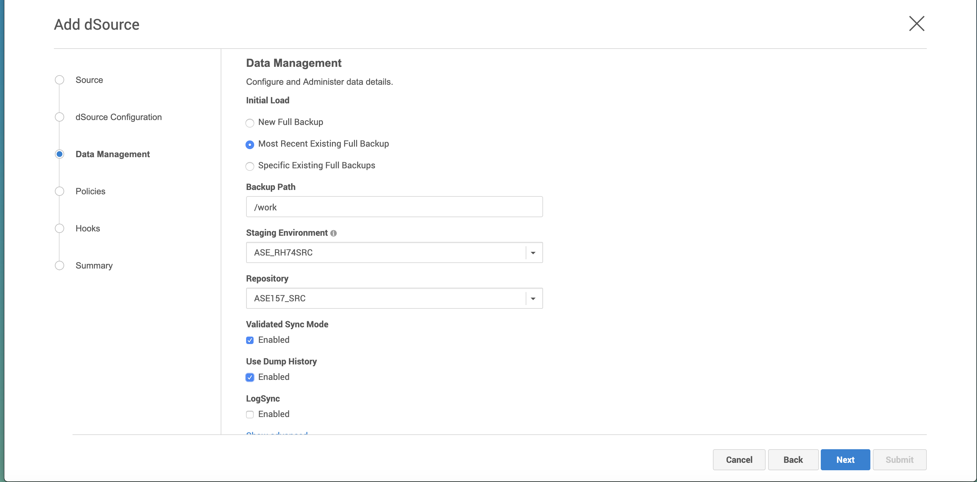 By default, Delphix uses the backup server log file to discover backup information. Users can switch to Dump History by explicitly enabling it for the dSource. Before linking a database with Dump History enabled, make sure that Dump History is enabled on the source ASE instance. To enable Dump History for the database being linked, go through the linking wizard and on the Data Management page, check the box marked "Use Dump History".