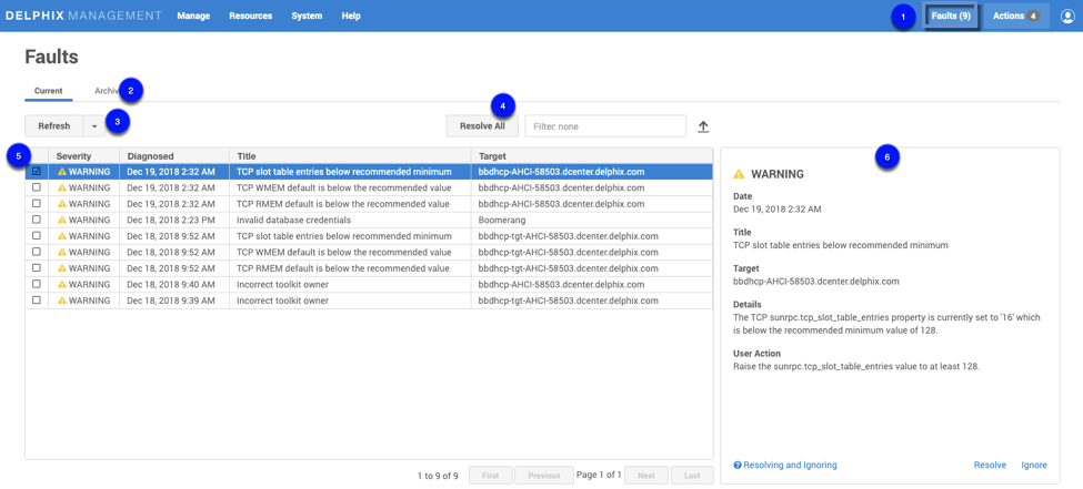 The Faults screen provides information on states and configurations that may negatively impact the functionality of the Delphix Engine and which can only be resolved through active user intervention. When you login to the Delphix management application as admin, the number of outstanding system faults appears on the right-hand side of the navigation bar at the top of the screen. Faults serve as a record of all issues impacting the Delphix Engine and can never be deleted. However, ignored and resolved faults are not displayed in the faults list.