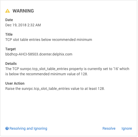 The Details section of the fault explains that the sunrpc.tcp_slot_table_entries property is set to a value that is below the recommended minimum of 128. The User action section instructs you to adjust the value of the sunrpc.tcp_slot_table_entries property upward to the recommended minimum. The process for adjusting this property differs between operating systems. To resolve the underlying issue, search "how to adjust sunrpc.tcp_slot_table_entries" using a search engine and find that the second result is a link to the Delphix community forum describing how to resolve this issue. After following the instructions applicable to your operating system, return to the Delphix UI and mark the fault resolved.