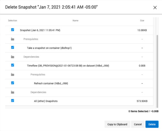 The Delete Snapshot dialog – The new snapshot dialog provides the complete steps on how to unlock the locked snapshot for deletion. It also allows users to select descendants and batch delete them. The dialog shows a tree of prerequisites and dependencies that must have an operation performed or be deleted in order to enable the deletion of the locked root snapshot. Prerequisites refer to operations that must be performed before the associated object can be deleted. Examples of prerequisite operations include: removing a keep-forever retention policy from a snapshot, deleting a Self-Service bookmark, or refreshing a dataset. Dependencies refer to objects that must be deleted before the parent object can be deleted. There is also a special All (other) Snapshots dependency item. This item represents all children snapshots of the parent Timeflow, which will also need to be removed, minus those with a dedicated row in the table.