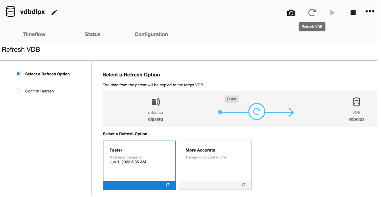 Once the VDB configuration changes are saved. Click the Refresh button and select the Snapshot from which to refresh.
