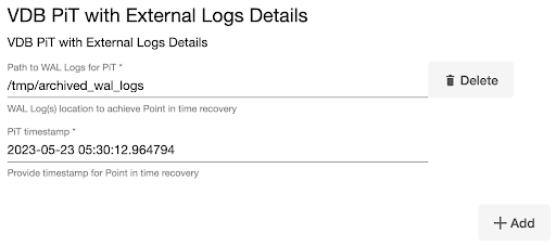Note: Users must click the “Add Button” for VDB PiT with External Logs details only once as the solution supports a single backup path. Providing multiple paths will result in an error during the linking process.Path to WAL Logs for PiT: Provide an absolute path to the archived WAL files available on the target environment.