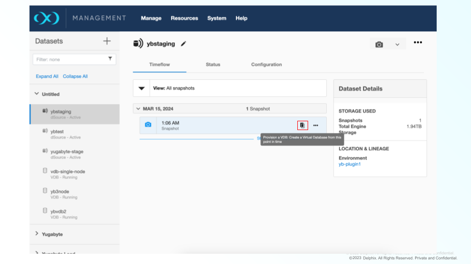 Select the dataset and the snapshot that you want to provision from. Click the provision VDB icon to open the provision VDB wizard.