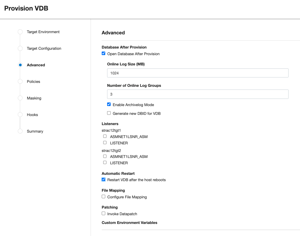 1. When provisioning a new VDB in the VDB Provisioning wizard, check the Automatic Restart box.