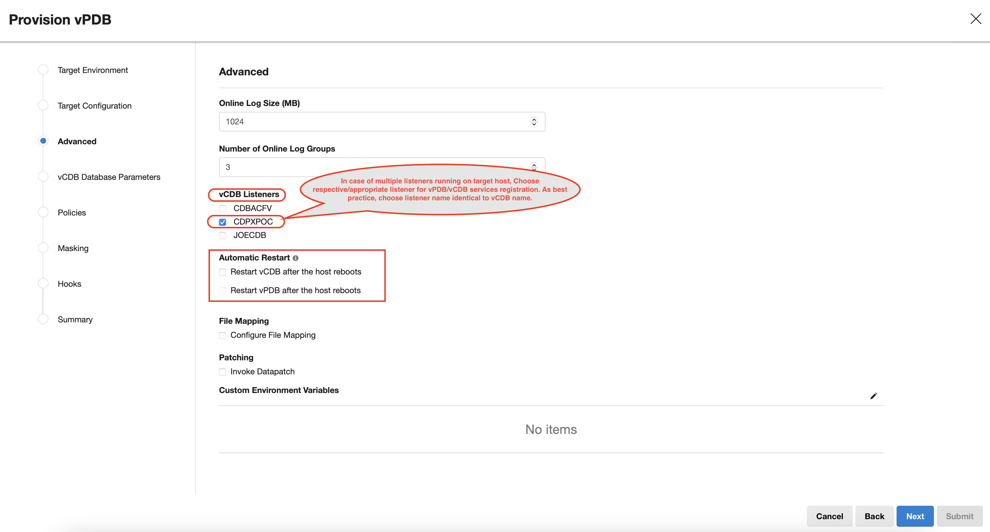 As prerequisites, provision the DBTechstack VDB first and then refresh the Target DB environment from Manage > Environments. This ensures the DBTechStack’s Listener is discovered for the Oracle database provisioning.