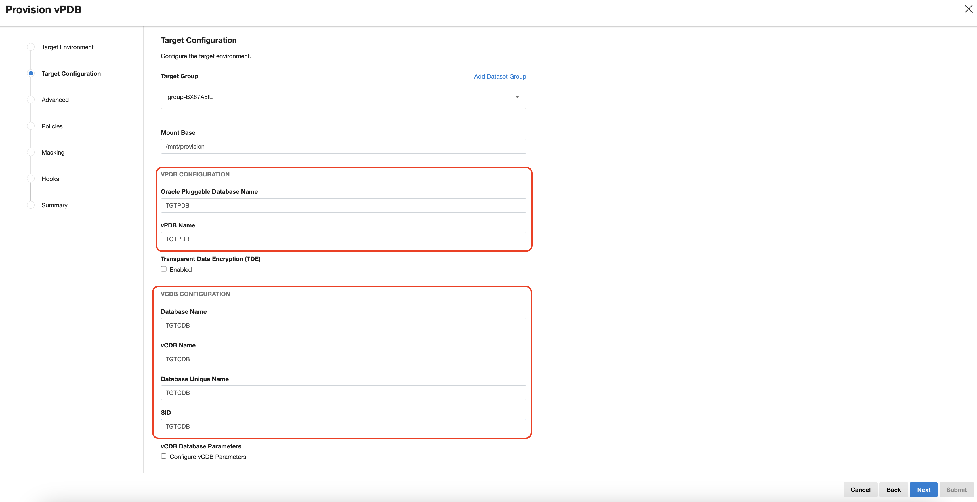In the vPDB Configuration section, provide the Target PDB name given during DBTechstack provision in the Oracle Pluggable Database Name field and provide any unique user-defined name in vPDB Name to be displayed in the Delphix Continuous Data Engine.