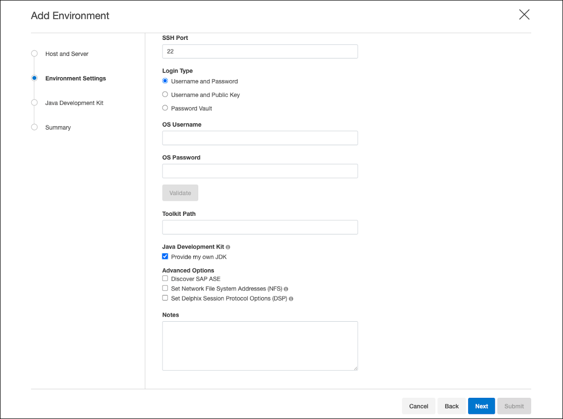 In the Environment settings tab, select the Provide my own JDK checkbox, and click Next.