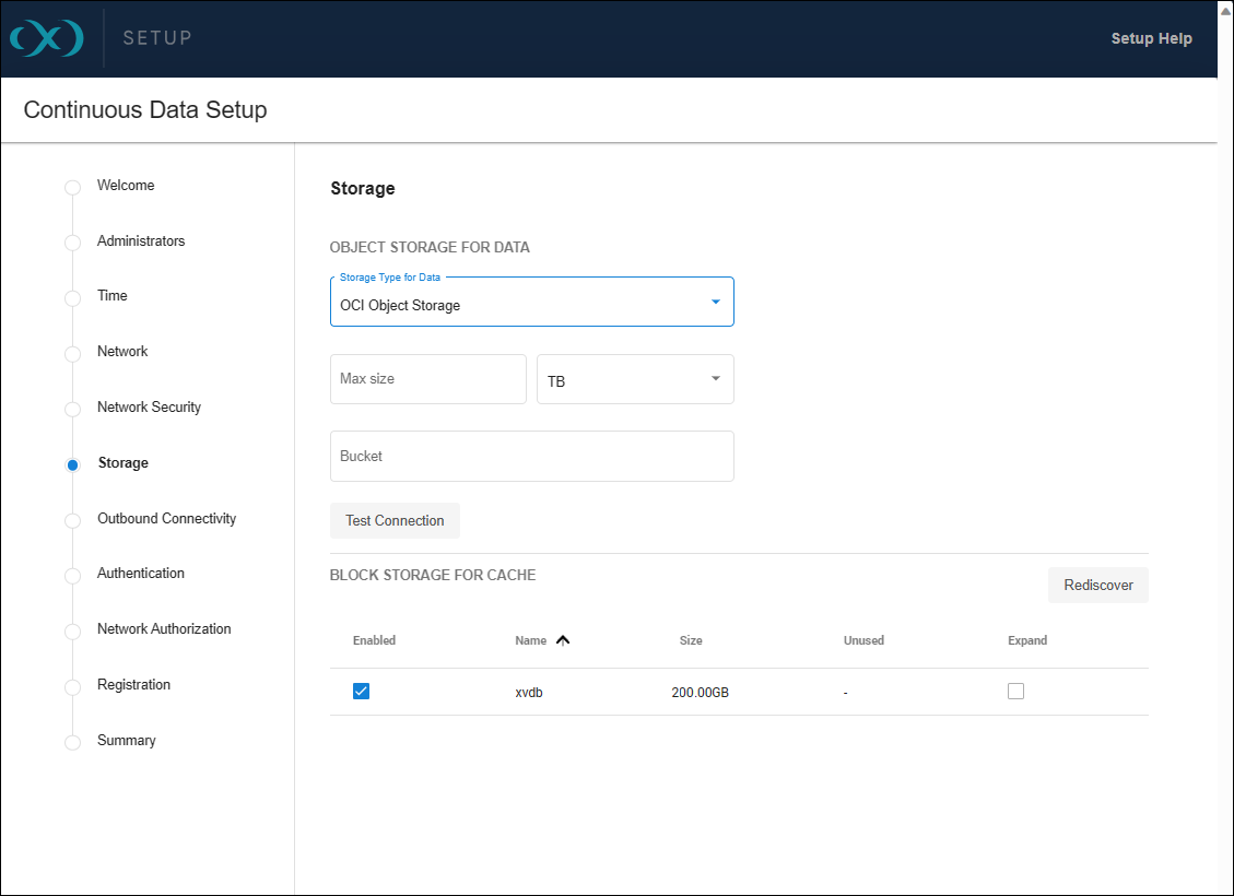 From the Storage setup page, select OCI Object Storage from the Storage Type for Data dropdown menu.