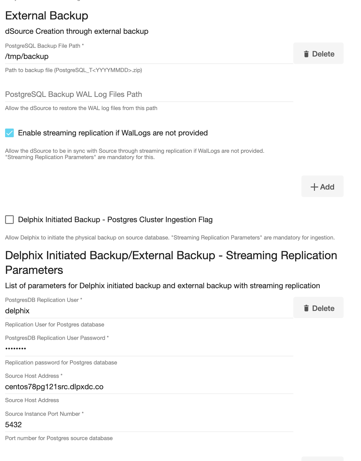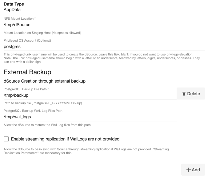 NOTE: The Add Button provided for Delphix Initiated Backup/External Backup - Streaming Replication is clickable multiple times but should be used ONLY once since the solution is built only to support a single backup path. Providing Multiple Paths will error out the linking process.