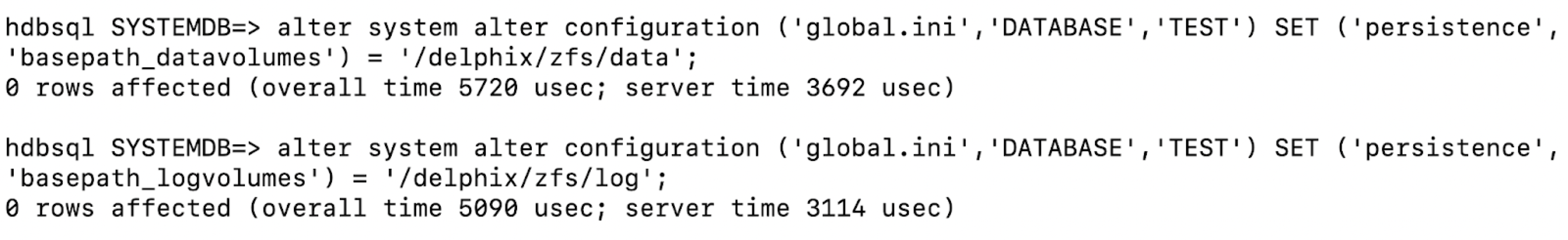 basepath_datavolumesandbasepath_logvolumesto data and logdirectory under the mount point, respectively. All the tenant data volumes and log volumes reside in the single mount point provided by Delphix.CODE//This query sets the value of basepath_datavolumes to within the delphix storage. alter system alter configuration('global.ini', 'DATABASE','{DATABASE_NAME}') SET ('persistence','basepath_datavolumes') = '{DELPHIX_MOUNT_LOCATION}/data'CODE//This query sets the value of basepath_logvolumes to within the delphix storage. alter system alter configuration('global.ini', 'DATABASE','{DATABASE_NAME}') SET (''persistence','basepath_logvolumes') = '{DELPHIX_MOUNT_LOCATION}/log'Example: