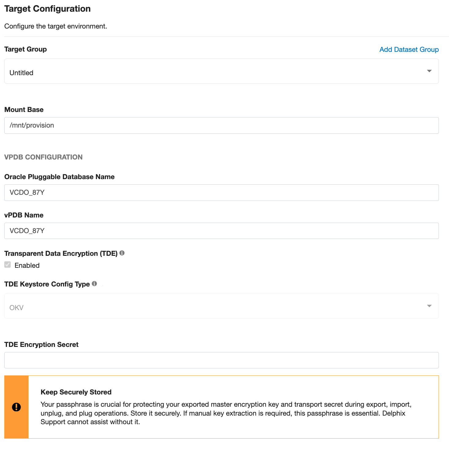 TDE Encryption Secret - Specify the passphrase which is required during unplug/plug operation of the vPDB. Warning: Make sure the TDE Encryption Secret is stored in a secure location for your records. It is only known to you. In the rare event that vPDB needs to be manually plugged from an unplugged vPDB, this passphrase will be required. Delphix Support cannot assist with manually plugging vPDB without this passphrase, therefore it should be known or recorded within your organization.