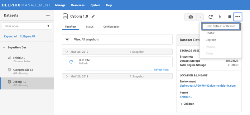 Under Datasets, select the VDB you want to undo your rewind/refresh for.